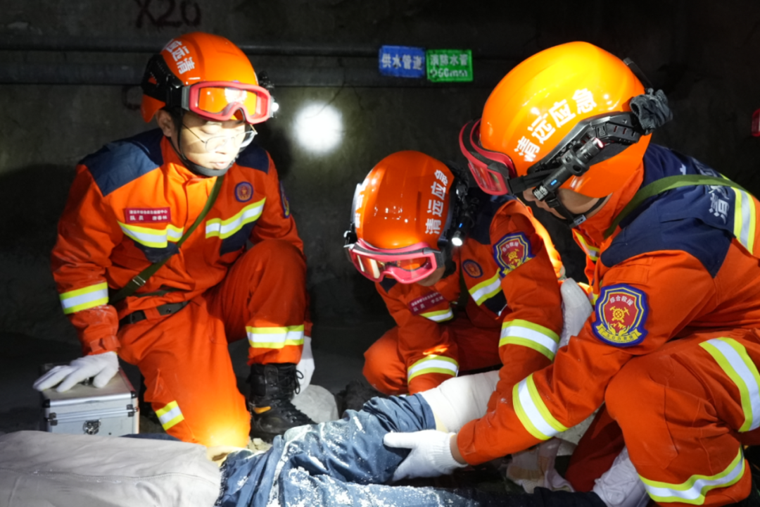 演练模拟2025年12月5日10时30分,连州市鹏盛矿业有限公司井下钻工班组正在+446m巷道进行作业时,巷道顶板传来异响,部分顶板冒落,一名钻工被冒落的石头压到腿部,无法撤离。其他井下作业人员迅速进行撤离,并报告值班室。企业值班员马上电话报告连州市安全生产委员会办公室及110、120、镇政府。随后,救援、医疗和警戒等各队伍纷纷抵达现场进行救援工作,在救援队伍将人员救出后,医疗救援员迅速为伤员进行紧急救治和转运。